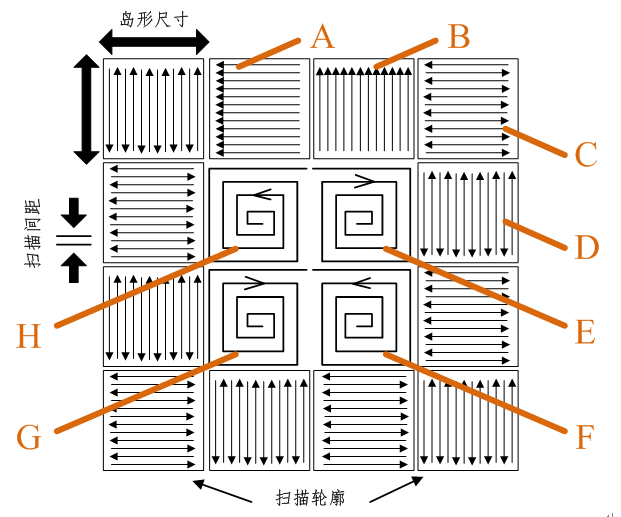 A水平单向扫描,B垂直单向扫描,C水平蛇形扫描,D垂直蛇形扫描,