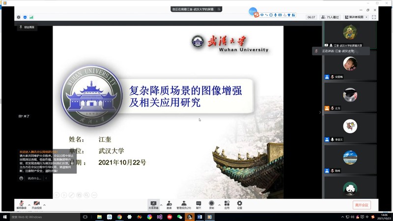 论坛邀请了武汉大学博士生、华为2021“天才少年”计划入选者江奎做了题为《复杂降质场景的图像增强及相关应用研究》的线上学术报告。江奎博士介绍了自己在图像/视频超分辨率重建、图像去雨、低可视度图像增强和图像去雾等方面的研究成果,以及在视频监控和自动驾驶等场景的应用,并指明了目前图像增强存在的问题,阐述了未来的研究思路和科研规划。最后,江奎博士就如何确定科研方向、如何解决科研中遇到的问题、如何在科研中获得好的想法并判断其可行性以及如何规划职业生涯等问题分享了他的经验。江奎博士的报告不仅使参会研究生学习到了图像检测和人工智能方面的知识和方法,而且对公司研究生今后的学习思路和科研以及职业生涯规划有很好的启发作用。